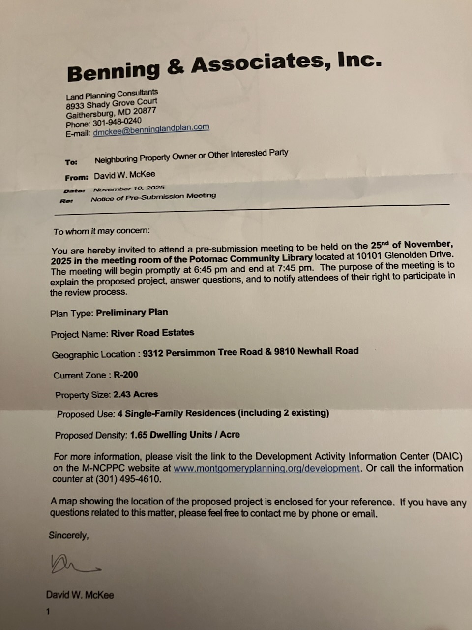 Please be aware that a pre-submission meeting will be happening on the 25th of November, 2025 in the meeting room of the Potomac Library from 6:45 PM to 7:45 PM.